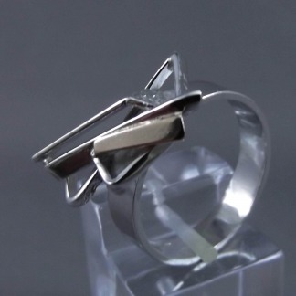 Aparte en exclusieve damesring zilver met goud, opengewerkt fantasiemodel.